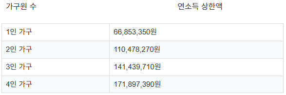- 가구소득: 가입일 현재 가구소득이 직전년도 기준 중위소득 250% 이하 이어야 합니다.