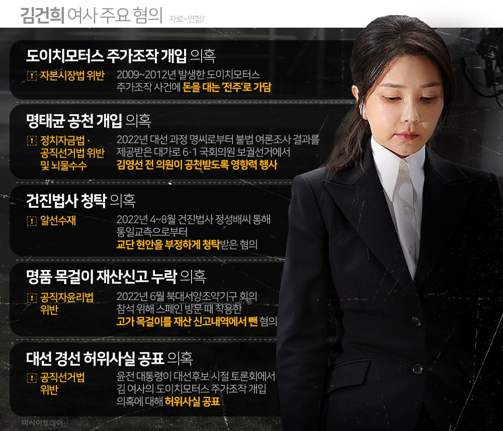 도이치모터스 주가조작, 불법 정치자금 수수, 통일교 관련 알선수재 등 혐의로 김건희 여사에게 구속영장이 발부되며 국민의 이목이 쏠리고 있습니다.